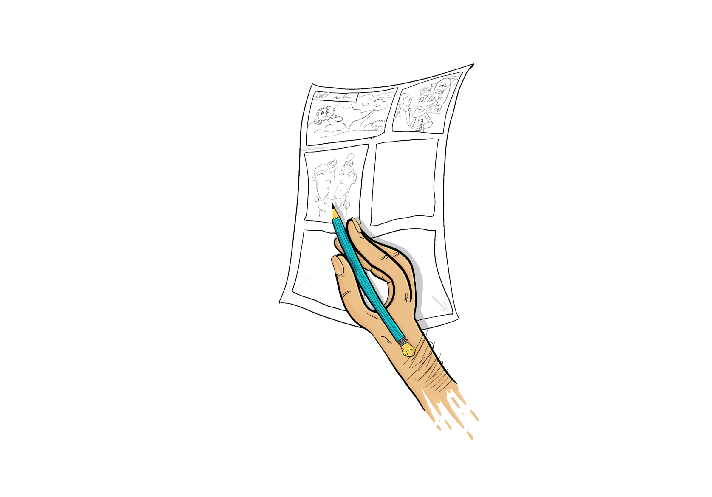 Une fois tous les éléments de la narration en main, nous commençons à dessiner une ébauche, des croquis, puis un storyboard. Plusieurs allers-retours entre nous sont possibles si tu souhaites modifier des éléments. Une fois le dessin validé, il ne changera plus et nous pouvons passer à l’encrage.